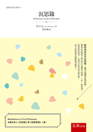 本書除收入《沉思錄》外,也一併收入《哲學原理》一書,此二者皆為笛卡兒的思想代表作。